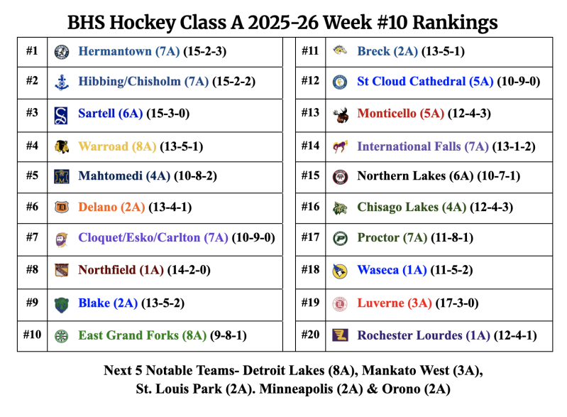 The Lakers may be the most disrespected Class A team in the state at the moment. Somehow, they did not even receive votes in the latest coaches' poll rankings. This is a good team out of 8A that is playing excellent hockey of late, as they are (6-1-0) in their last 7 games. That includes two more wins this week as they took down Willmar and Bemidji. Now this week, they have the second meeting with their rival, Fergus Falls, for “The Stick,” and they have a very good road test at ranked Cathedral.