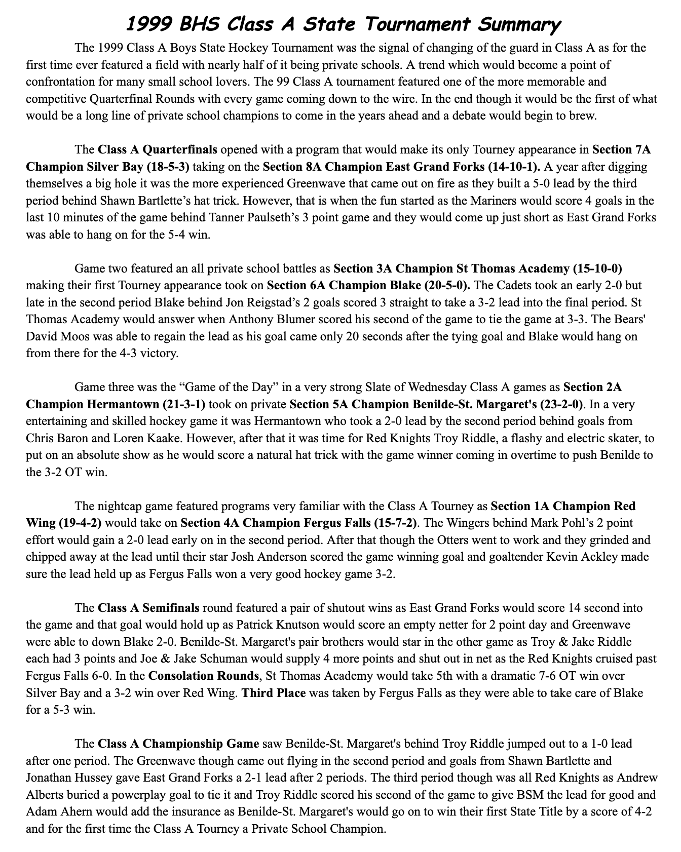 BHS 1999 Class A State Hockey Tournament