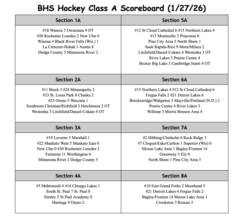 Check back here weekly for the latest results within BHS Class A Hockey